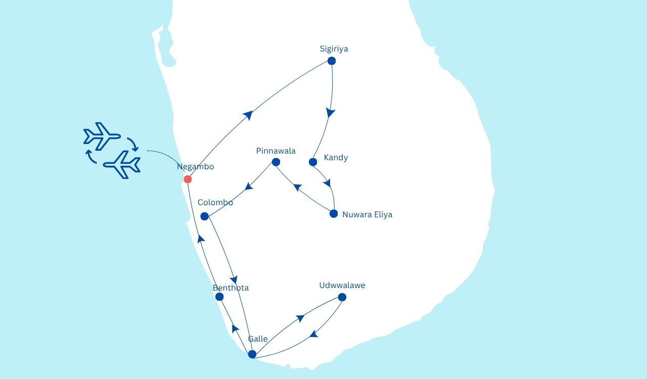 Negambo>Sigirya>kandy>Nuwra Eliya>Pinnawala>Colombo>Bentota>Udawalawe>departure